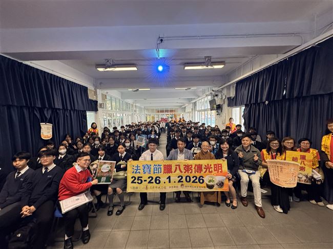 農曆十二月初八是釋迦牟尼佛成道紀念日,簡稱「佛成道日」。十二月是中國的臘月,所以又稱為「臘八節」。為讓大眾同霑佛陀成道的吉祥氣氛,香港佛光道場特別舉辦「2026法寶節臘八粥傳光明」活動與大眾結緣佛成道日。妙浩法師和義工菩薩蒞臨本校,向同學介紹「三好」精神——「做好事、說好話、存好心」的道理,同時施粥予中五級同學及老師享用,緬懷世尊修行和成道之因緣。