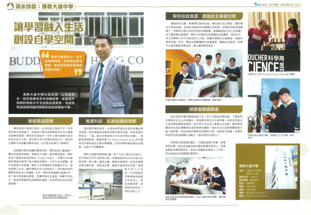 佛教大雄中學校風純樸,以同學為本,招校長擁有多年訓輔經驗,着重提升同學的學術水平及加強品德教育,為營造英語語境和讓同學開拓自我而精進不解……